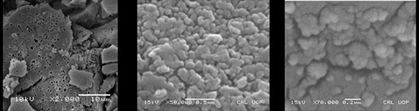 氧化鐵納米顆粒(8-15nm)負(fù)載在粒徑為149-177μm的活性炭上。FT-IR光譜顯示活性炭的表面官能團(tuán)為:OH,NH(3100-3500 cm-1),CH芳香族化合物(3000-3100 cm-1),CH脂肪族化合物(2800-3000 cm-1),C=O和CO(1640-1750cm-1)。負(fù)載在活性炭上的氧化鐵納米粒子的FT-IR表明在1050厘米脂族磷酸鹽拉伸特征峰-1和2300厘米-1并在470厘米赤鐵礦-1和570厘米-1所示圖1。SEM圖像顯示活性炭的多孔表面形態(tài),并且還反映了氧化鐵納米顆粒在活性炭表面上的分散,如圖2所示。